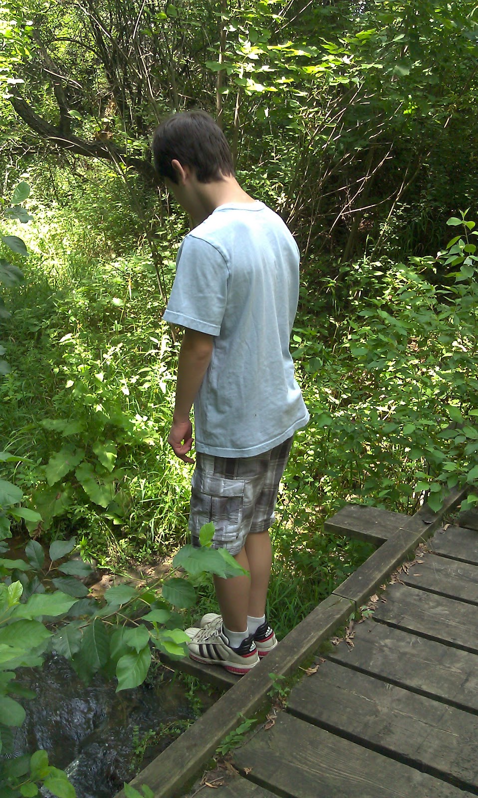 | A little bridge WITH NO GUARDRAIL. Matt chose to tempt fate by standing on the object most likely to break off and fall into the river below and give his mother a heart attack. |